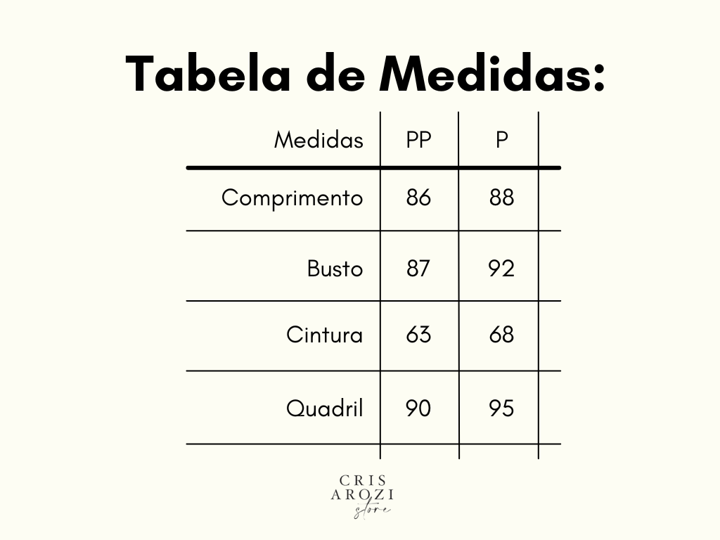 As medidas de busto, quadril e cintura são medidas da circunferência total.